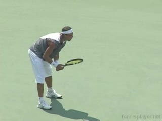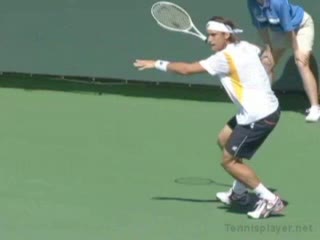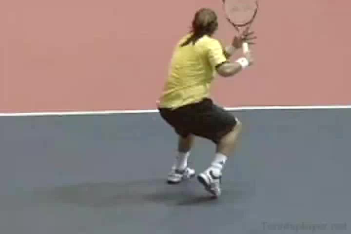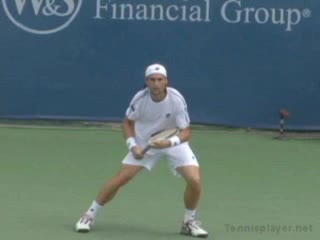 Nalbandian's forehand return from a neutral position, filmed from a side court-level angle. His racket meets the ball slightly in front of his lead hip with a moderately closed racket face and a compact, shortened swing path suited to handling a serve.