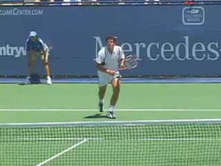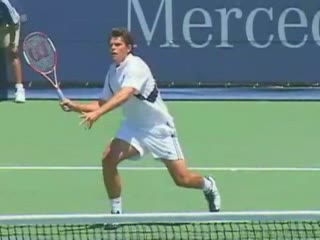 Henman's forehand volley from the net area, filmed from the front. His shoulders stay relatively square to the net with only a mild trunk rotation, making the forward trunk lean and brief uncoil easy to see as he steps through the volley in sequence with his upper body.