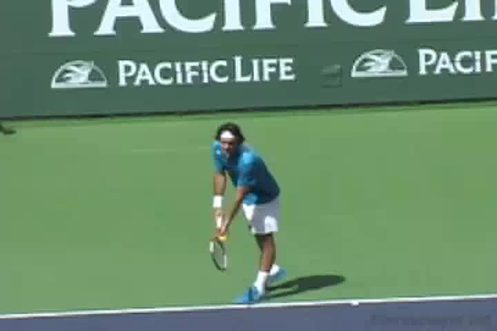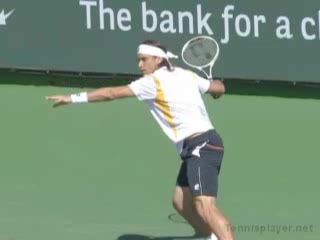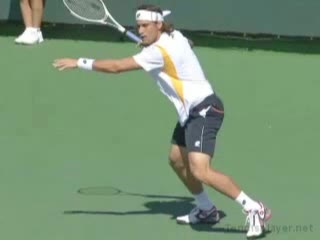 David Ferrer's forehand from the center of the baseline, filmed from a side CourtLevel angle. The video emphasizes a contact point slightly in front of his lead hip with a closed racket face and a low-to-high swing path that accelerates the racket head through the ball.