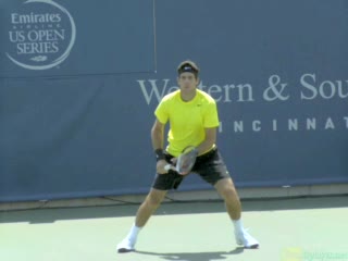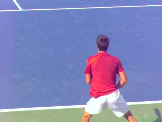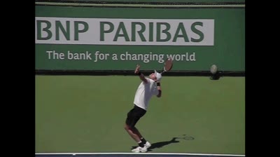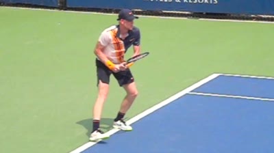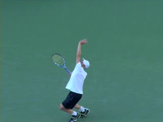 Isner's serve from a central baseline position, filmed from a side angle. His rhythmic footwork into the pinpoint stance is evident as his back foot slides up to meet the front foot just before leg drive and upward extension.