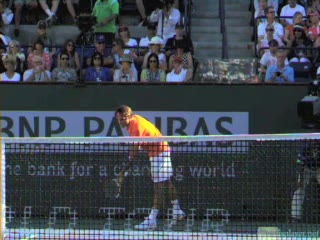 Berdych's forehand from a central baseline position, filmed from a side angle. His rhythmic 1-2 footwork pattern into a semi-open stance is clear as he loads on the outside leg before stepping through and recovering along the baseline.