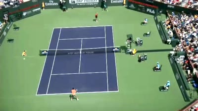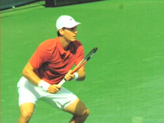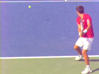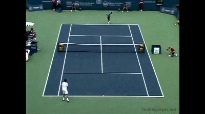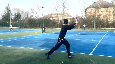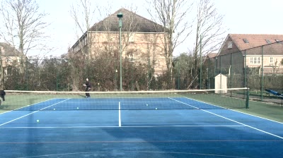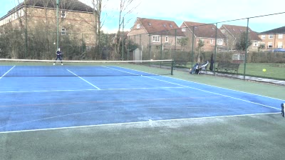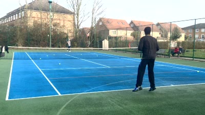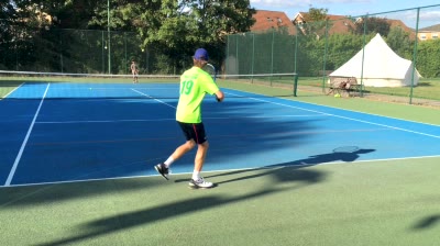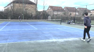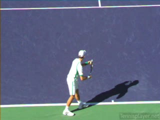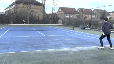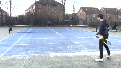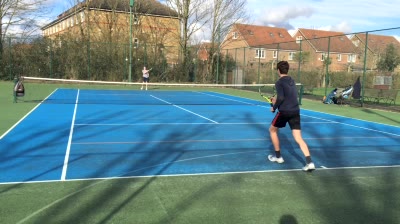 Nick Wheatley’s serve return from a central ready position, filmed from a court-level angle. The contact point is taken slightly in front of the body with a compact swing, and the racket face stays square to the incoming ball to control depth on the return.