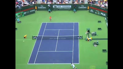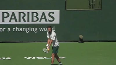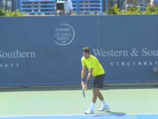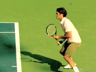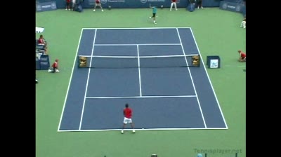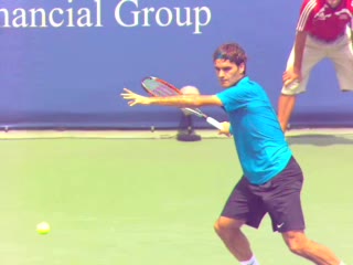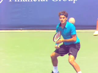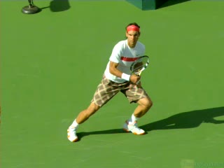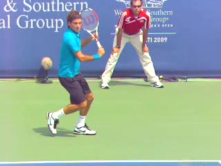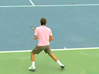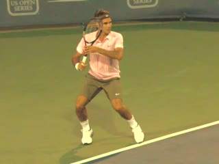 Federer's FH from the center of the baseline, filmed from a rear angle. His small adjustment steps before contact set up a strong neutral stance, followed by quick recovery footwork that returns him to an optimal court position.