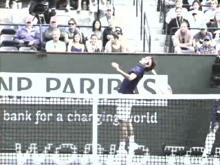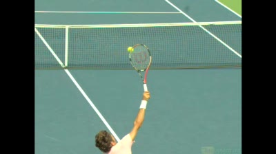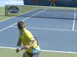 Wawrinka's serve from a central baseline position, filmed from a side angle. His deep knee bend and delayed hip uncoiling into the court make the leg drive and sequential hip rotation especially clear.