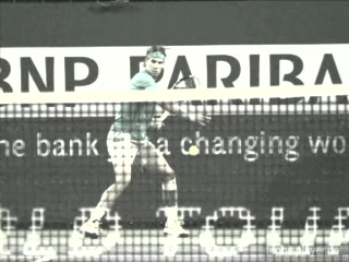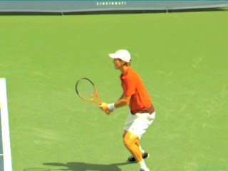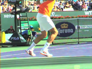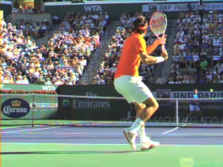 Nadal's forehand from a neutral baseline position, filmed from a side animation angle. His semi-western grip is clear as his wrist stays laid back through the swing before pronating aggressively just after contact.