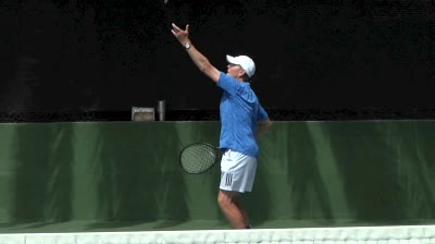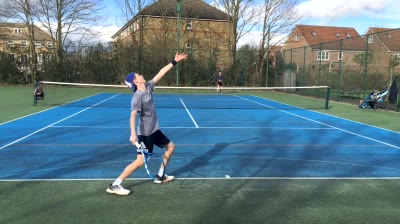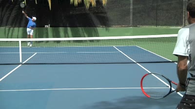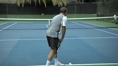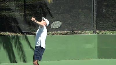 Nick Wheatley’s serve from the center baseline, filmed from a rear angle. His follow-through carries him into the court with his back leg swinging forward and his tossing arm dropping quickly into a balanced ready position for the next shot.