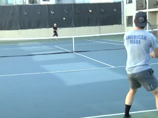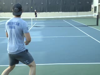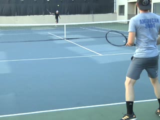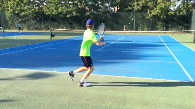 Nick Wheatley’s neutral rally sequence from a central court position, filmed from a court-level angle. His follow-through finishes high with the racquet wrapping across his body while his non-hitting hand quickly returns to the ready position to prepare for the next ball.