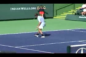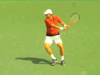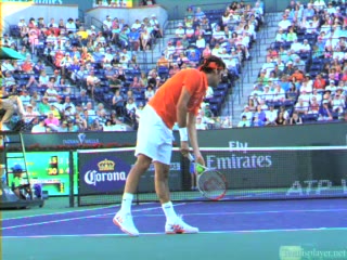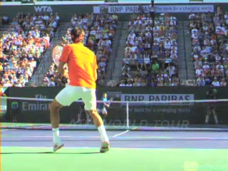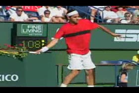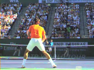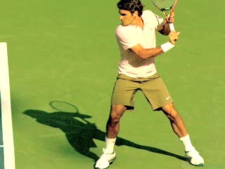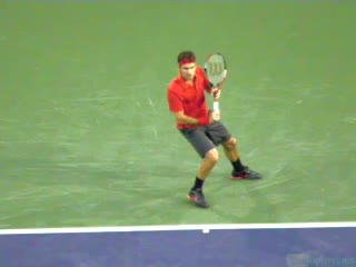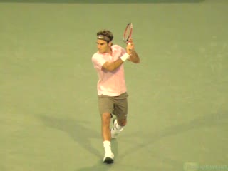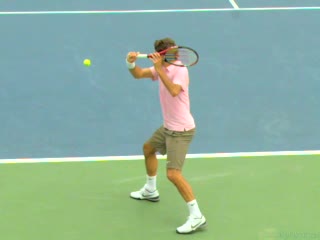 Roger Federer’s forehand from a neutral position, filmed from a side angle. His relaxed follow-through finishes high with the racquet wrapping around his shoulder while his weight transfers fully onto his front foot before returning to a ready position.
