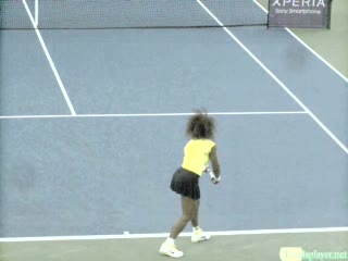 Serena Williams' serve from a central baseline position, filmed from a side animation angle. At contact, her racket face is slightly closed with the ball struck well above head height, and the racket head accelerates steeply upward along the right side of her body into a high, fast pronation.