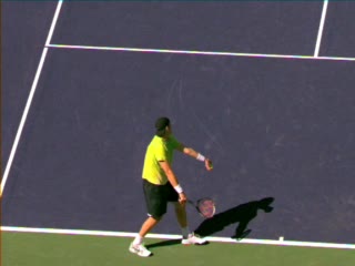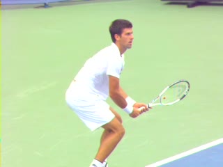 Nick Wheatley’s movement animation on a return point, filmed from a tactical overhead angle. His split-step precedes the server’s contact and he immediately retreats with quick, balanced adjustment steps to create space before planting into a stable hitting stance.