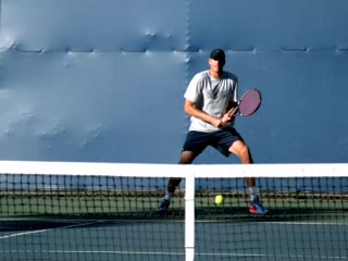 Nick Wheatley’s approach shot from the baseline, filmed from a side angle. His hips stay low with a deep knee bend on the loading step, then drive forward as his legs extend into the court to transition quickly toward the net.