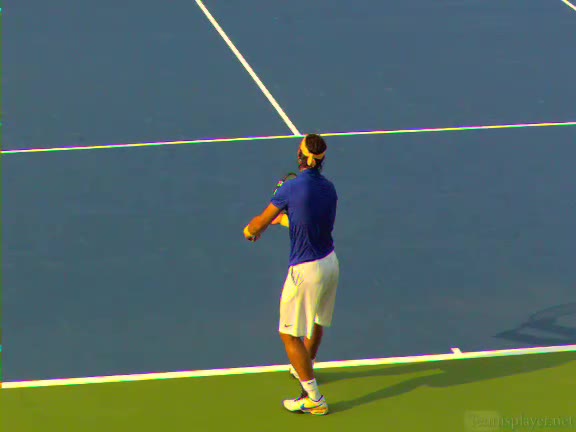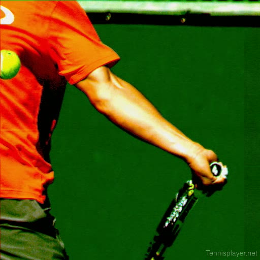 Rafael Nadal's serve from a neutral position, filmed from the side. His continental grip is paired with a very delayed wrist pronation, with the racquet head lagging behind the hand until just before contact.